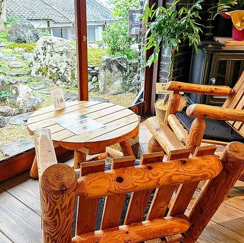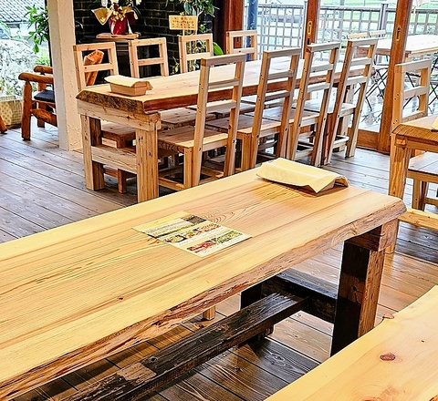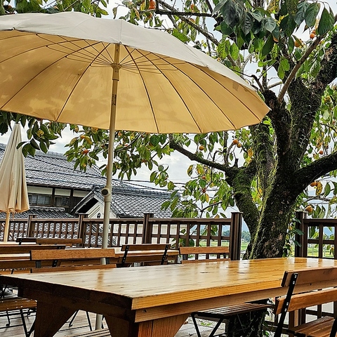 シンボルツリーの柿の木の下、やわらかな風と木漏れ日に包まれながら味わうお食事。亀岡の田園風景を一望できる人気のテラス席です。ワンちゃんとのご来店も可能です