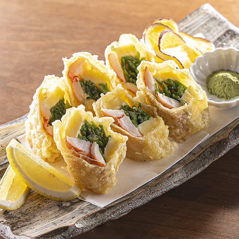 ひと口食べれば、思わず笑顔になる美味しさ。外はカリッとした衣で包まれ、中からは海老の食感とチーズのクリーミーさを感じられます◎ピーマンのほのかな苦味が味に深みを与え、食べ進める手が止まらなくなる★抹茶塩を振りかけることで、さらに引き立つ風味は、和食の新しい魅力を感じさせます♪