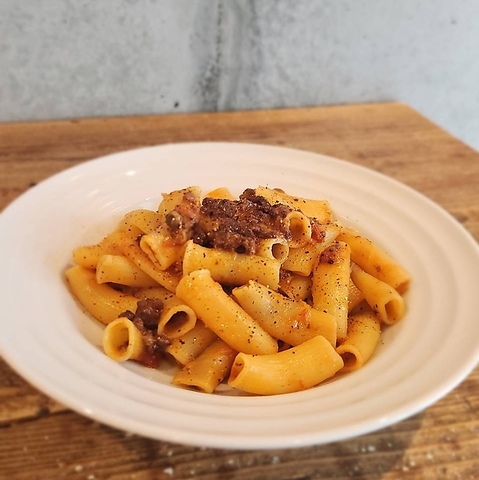 牛100%のひき肉を、たっぷりの香味野菜とイタリア産キノコを赤ワインとトマトでじっくり煮込んだラグーソース!
