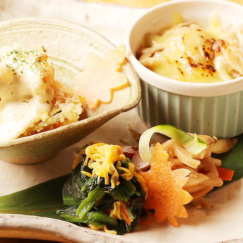 その日におすすめのおばんざい3種盛りや鮮度自慢の刺身5種盛り、天ぷら2種、〆には岐阜の冷やしたぬきと、楽名物が満載のコース!飲み放題120分付きでお得♪ ※写真はイメージです。