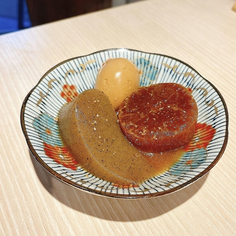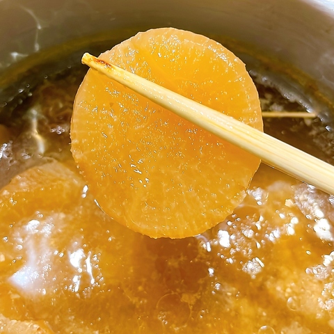 信州味噌出汁、煮卵、大根、ちくわぶ、ちくわ、こんにゃく、しらたき、キャベツ、牛ホルモン串と多種の味が楽しめます♪