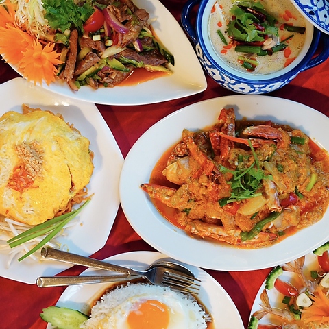 タイ好き集まれ!本場の味がここにある!タイ現地の味をそのままに、香り高いスパイスと旨みたっぷりの料理をご提供します。店内は明るく清潔で、ゆったり座れる広さも魅力。ランチにもディナーにも、気軽に立ち寄れるタイ料理屋です!ぜひお仕事帰りや普段使いで友人との食事や女子会など様々なシーンでご利用ください。