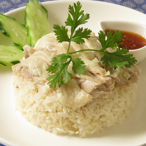 当店自慢の本格タイ料理を囲み、お好みのドリンクで「乾杯」!写真は「カオマンガイ」