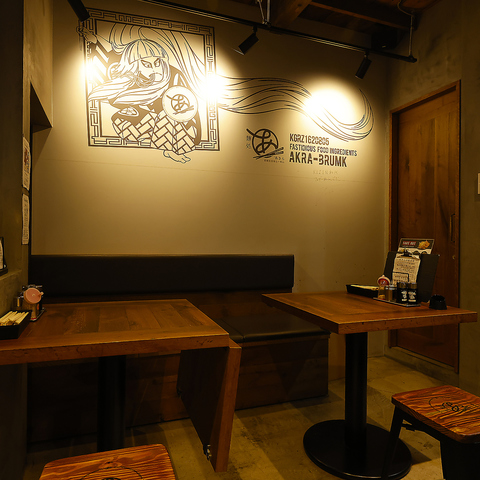 【テーブル席:2名掛け×2卓】壁面のイラストアートが目を引く、おしゃれな雰囲気のテーブル席。木のテーブルとスツールが、無機質な空間に温かみを添えています。仲間とワイワイ楽しむ宴会や飲み会にも最適です!少人数のでの飲み会・宴会も承っております◎是非、ご予約ください!