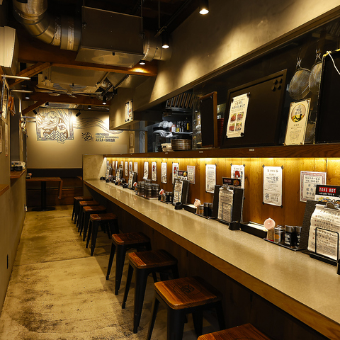 【カウンター席:8席】木目の美しいカウンター席は、木の温もりを感じる居心地の良い空間。目の前には調理場があり、出来立ての美味しいラーメンを、すぐに召し上がっていただけます。仕事帰りのサク飲みにも最適です♪