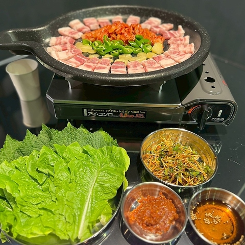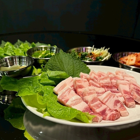 国産豚肉を使用したサムギョプサルは、当店の看板メニューです。皆で鉄板を囲み、サンチュに肉とキムチ、薬味を巻いて味わえば、賑やかな屋台気分を満喫できます!こちらは2人前からご注文できます!