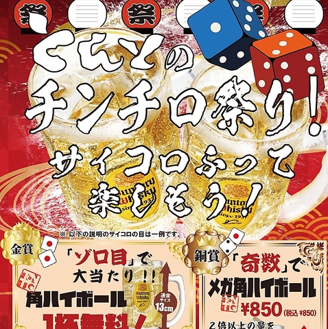 『ゾロ目』が金賞!大当たり~!!角ハイボールを1杯無料に!『偶数』で角ハイボールが半額。『奇数』でメガ角ハイボール850円税込に!