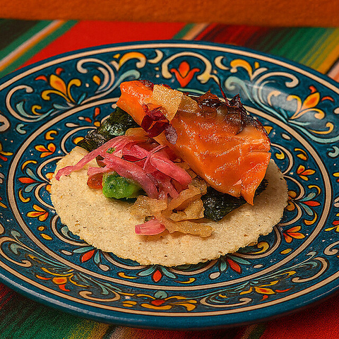 本場メキシコのスタイルに、世界各国のエッセンスを重ねたオリジナルタコスは全3種。メキシコ産トウモロコシ粉を使用した自家製トルティーヤで包む具材は、それぞれ異なる個性を放ち、ひと口ごとに新しい発見がある。ピリッと刺激的なサルサを添えれば、タコスは一層艶やかに変貌。