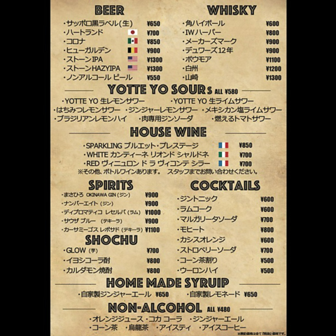 世界中の料理をYOTTE YO仕様に仕上げた、お酒に合うオリジナルメニューを豊富にご用意してます!