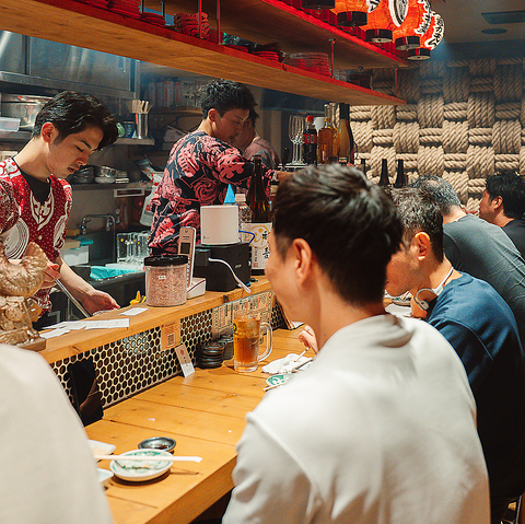 地下鉄御堂筋線「梅田駅」から徒歩5分という好立地にありながら、まるで東梅田の隠れ家のような雰囲気です。店内は、活気がありながらも落ち着いた大人の空間で、元気なスタッフが明るい雰囲気でお出迎えいたします。