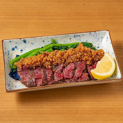 鶏料理だけでなく、こだわりの特選肉もご用意しています。柔らかな和牛もも肉を紹興酒に漬け込むことで、芳醇で奥深い味わいに仕上げた一品です。備長炭の高温で炙ることで、濃厚な旨みが凝縮され、日本酒や焼酎との相性も抜群です。