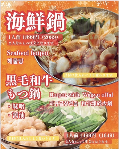 この時期にぴったりの心温まる鍋メニューをご用意しました!海の幸がたっぷり詰まった「海鮮鍋」と、濃厚な肉の旨味が楽しめる「黒毛和牛もつ鍋」をぜひご賞味ください◎仕入れによって具材が変わるため、訪れるたびに新しい発見をお楽しみいただけます♪友人や家族と一緒に、心温まる鍋を囲んで、素敵なひとときをお楽しみください!