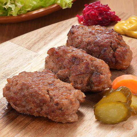 スパイスで味付けしたひき肉を炭火で焼いた、ジューシーなルーマニア伝統料理。マスタードとパンを添えて。