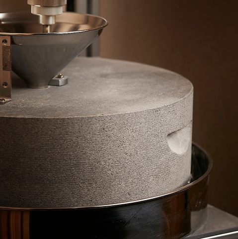 京都嵐山の「石臼工房石谷」製作の石臼で店内にてそばの実を挽いてます