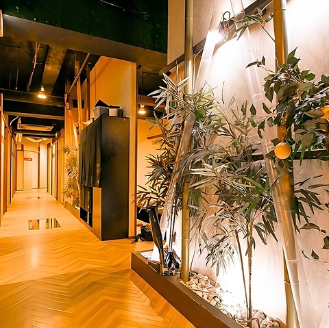 【和の風情溢れる座敷】明るい木目調の床と温かい間接照明、そしてモダンな竹の植栽が心地よい和の風情を演出するお座敷席です。こちらは、他のお客様を気にしないプライベートな空間で、ご家族での団らんや、ママ友同士のゆったりとした食事会など、肩肘張らないカジュアルなご利用に最適です。