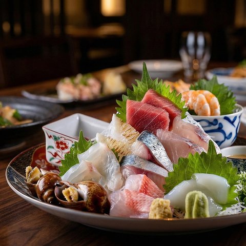 旬の海鮮と厳選肉を贅沢に味わう本格料理が自慢◎看板メニューの「刺身4点盛り」は鮮度抜群の旨みが際立ち、コク深い「牛もつ鍋」、ジューシーな「鶏ももの山賊焼」、脂の乗った「シマホッケ焼き」など、こだわりの逸品をお手頃価格でご提供いたします♪