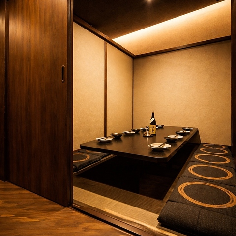 【落ち着いてゆったり寛げる】足をゆったり伸ばせる掘りごたつ個室を完備。落ち着いた雰囲気の中で、誰にも邪魔されずゆったりとお食事をお楽しみいただけます。接待や少人数の飲み会に最適です。心から寛げる空間で、自慢のお料理とお酒ををご堪能ください。