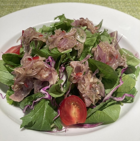 マグロ(ミディアムレア)、トマト、グリーンレタス、赤キャベツ ドレッシングにフレッシュエシャロットとレモングラスのソース