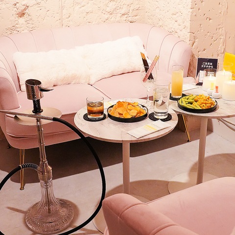 【4階】ピンクと白を基調としたゆったり空間。デートでのんびり語り合うにも、ご友人同士で深夜までくつろぐにもぴったり。心ゆくまでシーシャと会話をお楽しみいただけます。【フードドリンクのみのご利用が可能です!】