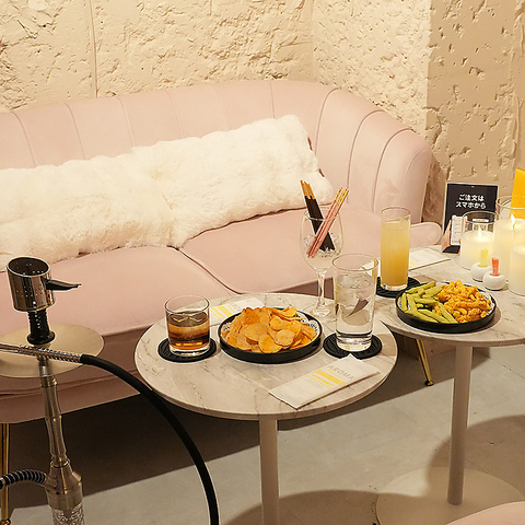 【4階】ピンクと白を基調としたゆったり空間。デートでのんびり語り合うにも、ご友人同士で深夜までくつろぐにもぴったり。心ゆくまでシーシャと会話をお楽しみいただけます。【フードドリンクのみのご利用が可能です!】