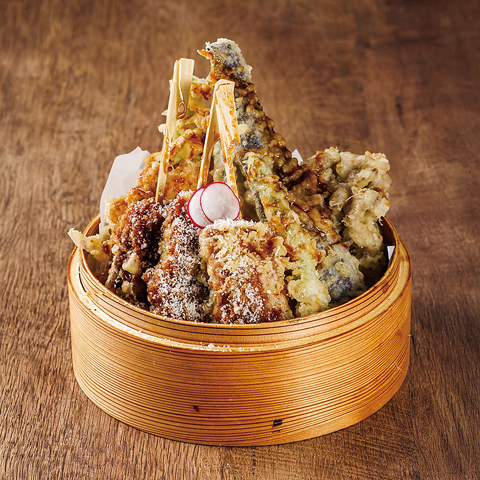 ★★なんばパークス限定天ぷら★★<内訳>エビ2本、キス1枚、イカ1本、鶏天3カン2本、南京1枚、茄子1本、竹輪1/2本、舞茸1枚※ディップ付き