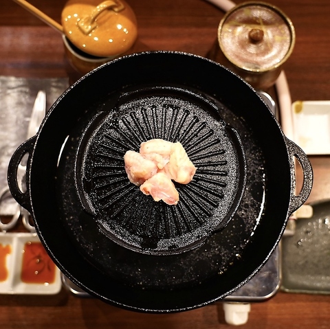新感覚の鶏焼肉は自分で鉄鍋の上部で鶏を焼くスタイル!さらに下部には出汁が入っていて鍋になってますのでそこにお通しの白菜で鍋が完成!