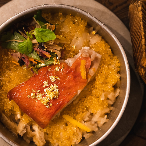 当店名物「イクラどっさり鮭のハラコ釜めし」は、その名の通りイクラと鮭のハラコを惜しみなく盛り付けた逸品です。見た目のインパクトはもちろん、口の中で弾けるイクラの塩気と鮭の旨味がたまりません。これを食べずして帰れません!お値段は2178円(税込)でご提供しております。