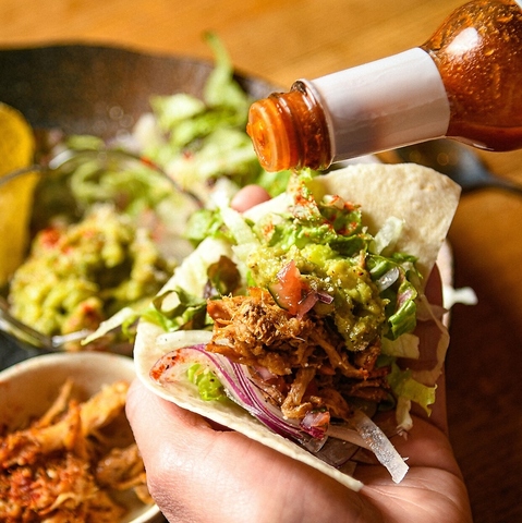 人気ナンバー1!何時間も丁寧に煮込んだ柔らかい豚肉に、絶妙なフレッシュサルサとチーズを合わせた自慢のタコス!ボリュームたっぷりで、満足感がハンパない名物です!