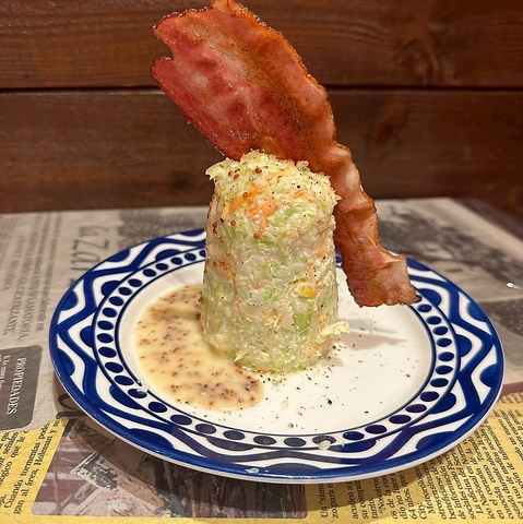シャキシャキ野菜に濃厚ドレッシングをまとわせ、カリカリベーコンを大胆にトッピング。見た目のインパクトだけでなく、食べ応えも抜群。粒マスタードの酸味とベーコンの香ばしさが絶妙にマッチした、やみつき必至の一皿です。