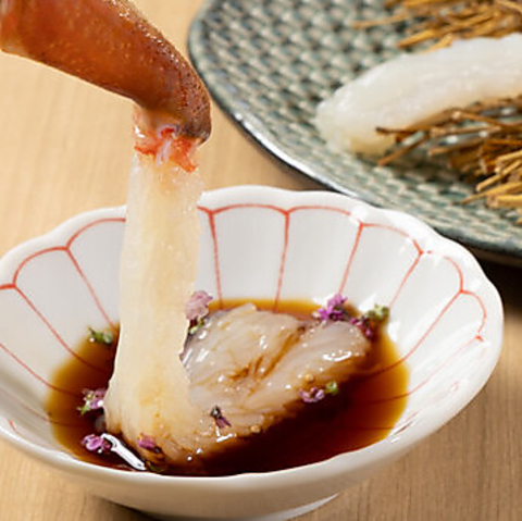 その日の仕入れに合わせて、蟹の種類や部位に最適な調理法を選択します。お造り、焼き、しゃぶしゃぶなど、多彩な料理法で蟹の魅力を引き出す「蟹善おすすめコース」をぜひご堪能ください。