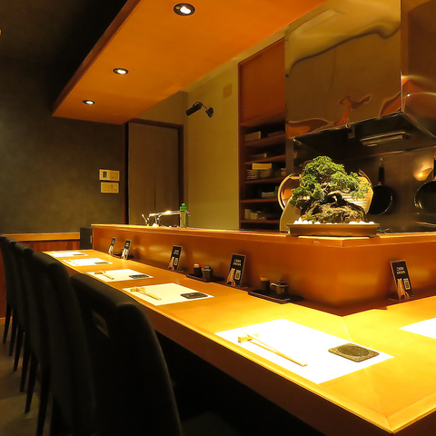 【多彩なシーンに使えるカウンター席】和やかな時間が流れるカウンターには、8つのお席をご用意。おひとり様はもちろん、ご夫婦やカップルのデート利用にも大変おすすめです。しっぽりと過ごすのも良し、会話に花を咲かせるも良し。心安らぐ空間の中、贅沢な大人時間をお過ごしください。