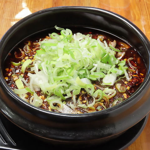 鍋に触れている部分の豆腐や肉そぼろが鍋の熱で軽く焦げつき、香ばしい食感が魅力!とろとろの中心部とカリッとした外側の違いをお楽しみください。石焼の器で最後の一口まで熱々を楽しめます♪