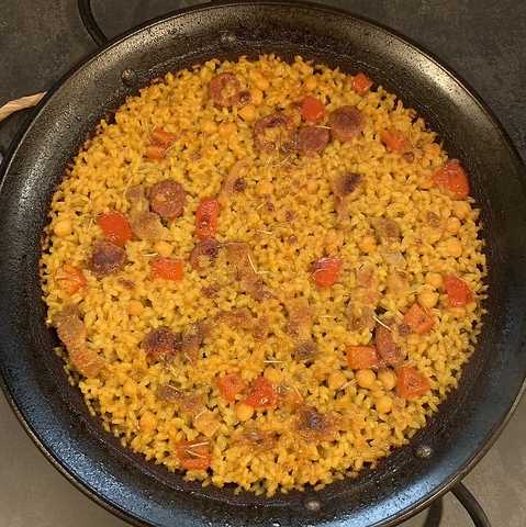鶏肉と魚介のパエリアは3850円(税込)。鍋でじっくりと時間をかけて取った出汁が味の決め手です。海老とあさりの磯の風味、鶏肉のコクが見事に調和した、本格的なパエリアをご賞味ください。