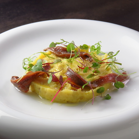 ほくほくとした甘みのあるさつまいもに、スペインの定番ソース「アリオリ」(ニンニクマヨネーズ)を合わせた一皿。仕上げにカンタブリア産の上質なアンチョビをのせ、濃厚なコクと塩味が絶妙に調和する、ワインにもぴったりの前菜です。