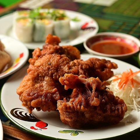 「ハーブ風味の鶏からあげ」は、ひと味違う美味しさを追求した当店オリジナルの唐揚げです!美味しさの秘密は、熟練のコックさん特製のタレにあります。特製タレに、タイのハーブを丁寧にブレンドして、もみ込むことで、肉の奥深くまで豊かな香りと旨みを閉じ込めた、風味豊かな味わいです。