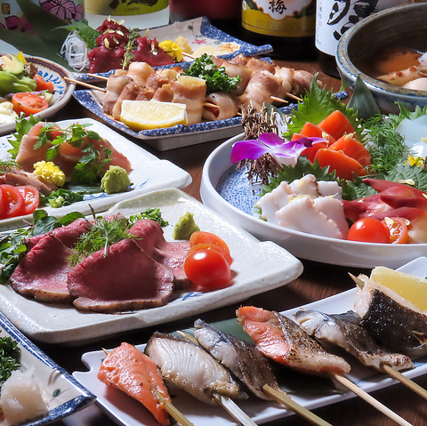 当店自慢の炉端焼きは、素材の味を最大限に引き出す炭火でじっくりと焼き上げ、香ばしさがたまらない逸品です♪見た目も華やかな「野菜巻き串」や、定番の「焼き鳥」もご用意しており、写真映えも抜群!さらに、生ビールを含む100種類以上のドリンクが楽しめる「飲み放題付きコース」も取り揃えております◎ぜひ素敵な時間をお過ごしください。