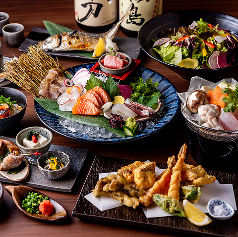さっぱりとした白身魚の薄造りや、香ばしく焼き上げた薩摩地鶏の炭火焼き、本日の焼魚、海の幸を盛り込んだ海鮮鍋など、旬の味覚を気軽に楽しめる“旬香コース”。〆は出汁の旨味が染み込んだ稲庭うどんで。全7品は、会社宴会やグループ利用にぴったり。生ビールを含む2時間飲み放題付きで、コストパフォーマンスも抜群