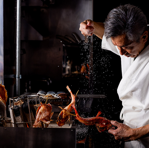 目の前で繰り広げられる躍動感溢れる原始焼きは、訪れる人を魅了。新鮮な喜知次や黄金鯵、大海老などの高級魚をライブ感あるパフォーマンスとともにご堪能いただけます。素材本来の旨味を引き立てるこだわりの料理を、五感でお愉しみください。