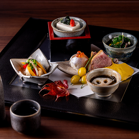 前菜三種から始まり、旬の鮮魚盛り合わせ、一本焼きの焼魚、揚げたての天麩羅盛り合わせなど、和の技が光る“雅趣コース”。メインは一人ひとつの紙鍋で、出汁の香りとともに贅沢なひとときを。〆はさらりと楽しめる茶漬けで、食後には水菓子または甘味をご用意。接待や会社宴会、特別な集まりにも最適な内容。