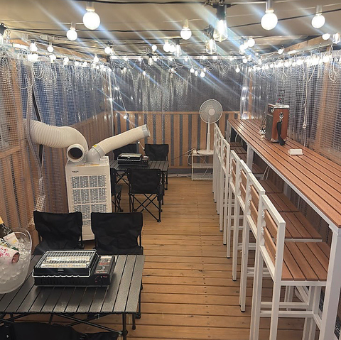 【テラス席で開放的な時間】2階テラス席はエアコン完備で快適。BBQや持ち込みOKの自由なスタイルで、仲間と過ごす時間をより特別に演出します。天神の中心でありながら、屋外の開放感を味わえる空間は、昼飲みや週末の集まりにも最適。都会の中でアウトドア気分を満喫できます。