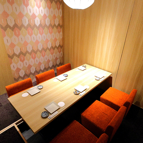 【8名様個室】接待やデートなどにオススメの、8名様用のテーブル式完全個室です。プライベートな空間ですので、他のお客様を気にされることなく自慢の海鮮料理やこだわりの日本酒をじっくりとご堪能いただけます。和モダンな落ち着いた雰囲気の中で、充実したひと時をお過ごしください。