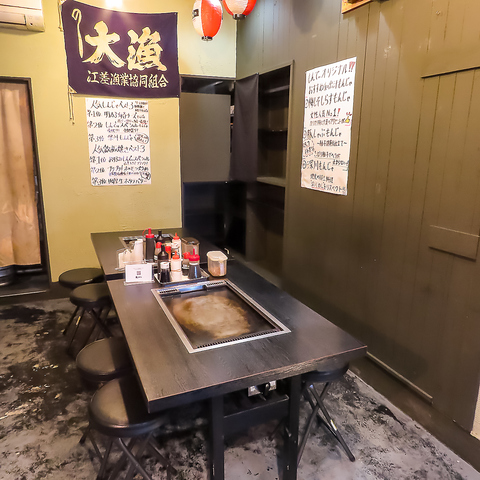 【居心地のいい店内!】お一人様でも気軽にご来店いただける店内は、ご友人や同僚との飲み会、デートなどにも最適です♪お仕事終わりのサク飲みや、ご家族でのお食事など、幅広いシーンでご利用ください!アットホームな店内で、お酒ともんじゃ×浜焼きをお気軽にお楽しみいただけます♪