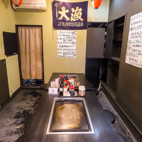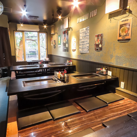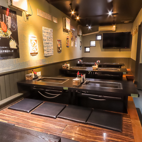【店内席情報】1階テーブル席は、カジュアルな雰囲気でお仲間と気軽に楽しむのに最適♪2階掘りごたつ席は喫煙可能となっており、落ち着いた空間でゆったりとした時間を過ごすことができます!各テーブルに鉄板がございますので、焼きたての美味しい状態でお召し上がりいただけます♪