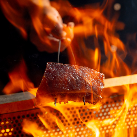800~900度まで達する豪快な炎で表面のみを瞬時にムラなく焼き上げ、また、わらが燃えるときに発する煙や香りが素材の旨みを一層引き立てます。ダイナミックな炎を上げるわら焼き場。ここからテーブルへダイレクトに届けられる 「わら焼きメニュー」 の数々こそ、このブランドの真骨頂です。