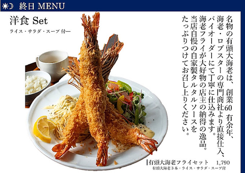 圧巻の有頭大エビフライ3匹プレートが看板商品!