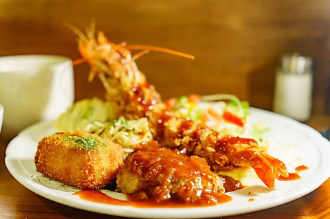 一番人気の洋食プレート。有頭大エビフライにカニクリームコロッケに、ハンバーグミニorハーフカツorミニミンチカツor白身魚フライからお選びください。※サラダ・ポテサラ・パスタ・スープ・ライス付き