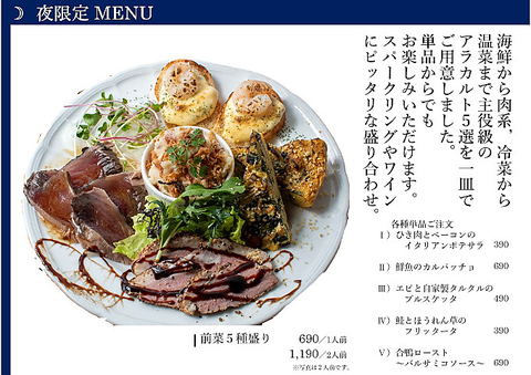 肉・魚・野菜を一皿でお召し上がりいただけます。樽出しスパークリングとの相性も抜群!まずはこの一品からお楽しみください。