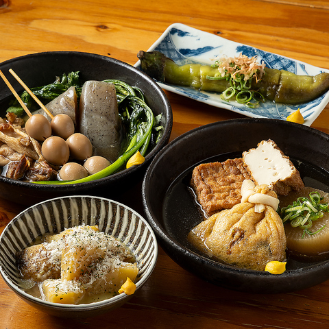 特製の鶏出汁おでんは定番の大根や厚揚げ、ネギと生姜をお揚げに詰め込んだ『ネギ袋』などの変わり種もご用意!ちんぷんかんぷんで人気のチーズ豆富や大根唐揚げをはじめ、やみつき人参カラムーチョやにわかせんぺいを添えた黒豆クリームチーズなどオリジナルのメニューも取り揃えております!