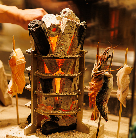 素材に自信があるからこそできる、シンプルで贅沢な炉端焼き。囲炉裏の炭火でじっくり焼いた大トロいわしや天然の大海老をはじめ、旬の魚や焼き野菜など、出来立てほかほかのお料理を楽しめます。落ち着いた店内で炭火のぬくもりを感じながら、炉ばた焼きならではの逸品をぜひお楽しみください。