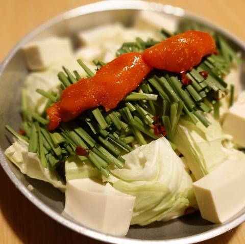 国産もつを使った博多もつ鍋に辛子明太子を乗せました。